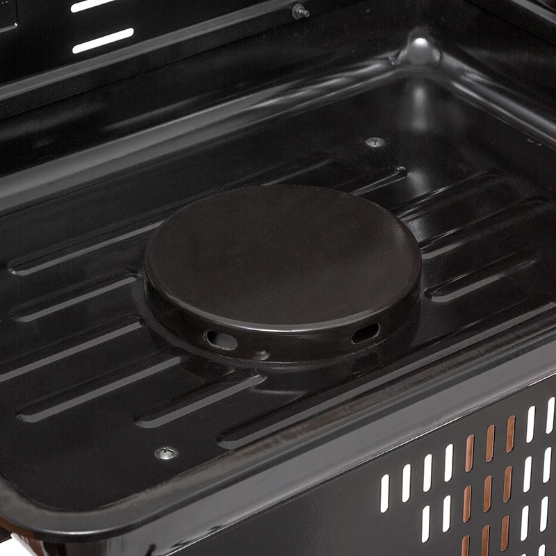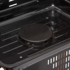 Il offrira tous les avantages que peut vous donner un barbecue à charbon ! Il comprend une cuve rectangulaire et une desserte en bois destiné aux aliments et aux accessoires.