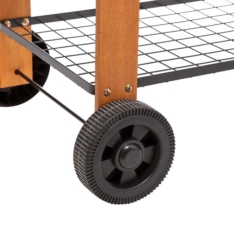 Plateforme de rangement et Ă©tagères latĂ©rales en position basse pour y disposer le maximum d’objets. Deux grandes roues facilitent les dĂ©placements dans le jardin.
