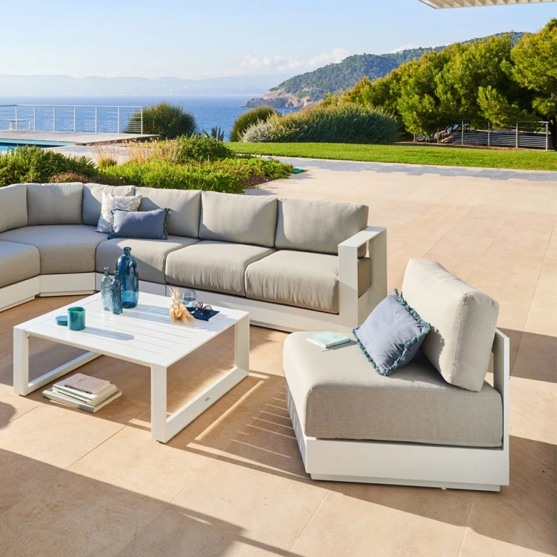 La structure est en aluminium traitĂ© Ă©poxy antirouille. Les coussins polyester 275 g/m² sont dĂ©houssables pour un entretien facile et traitĂ©s dĂ©perlants permettant Ă l’eau de glisser sans pĂ©nĂ©trer dans la matière.