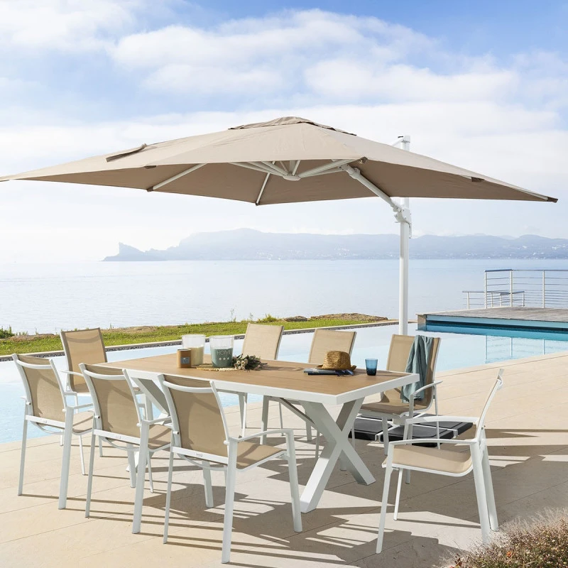 Protégez vous du soleil tout au long de la journée grâce au parasol décentré Eléa carré inclinable coloris noisette et structure blanche de la marque Hespéride.