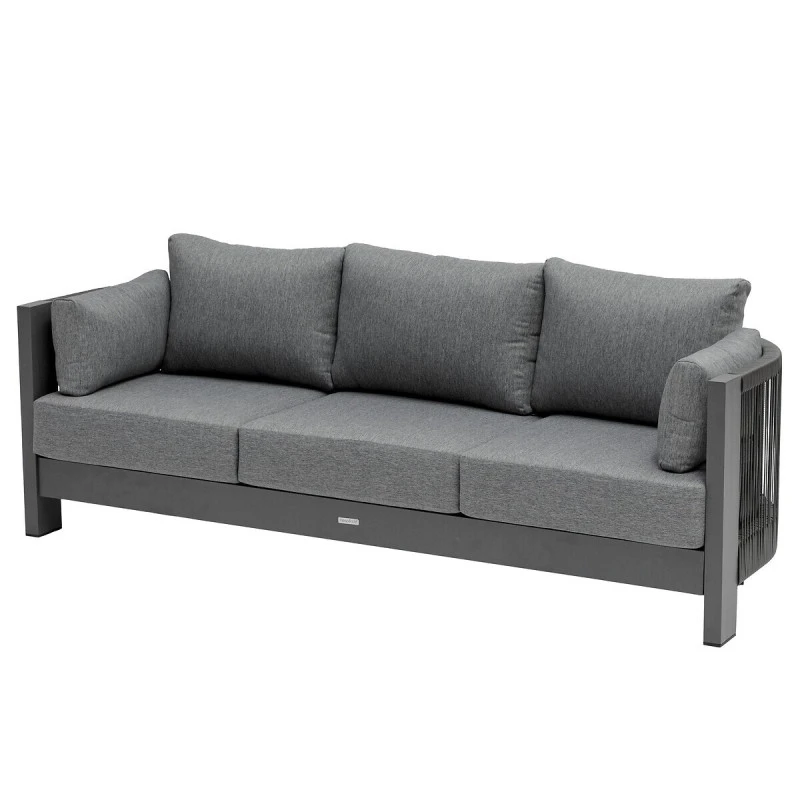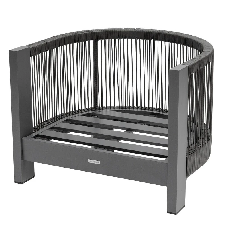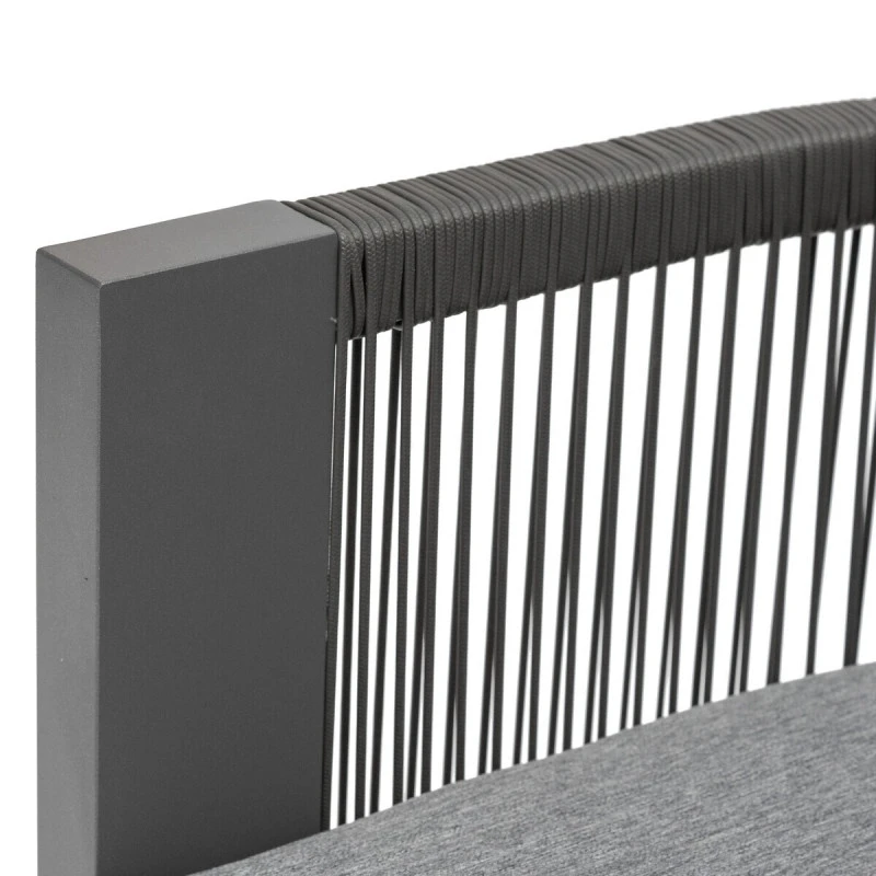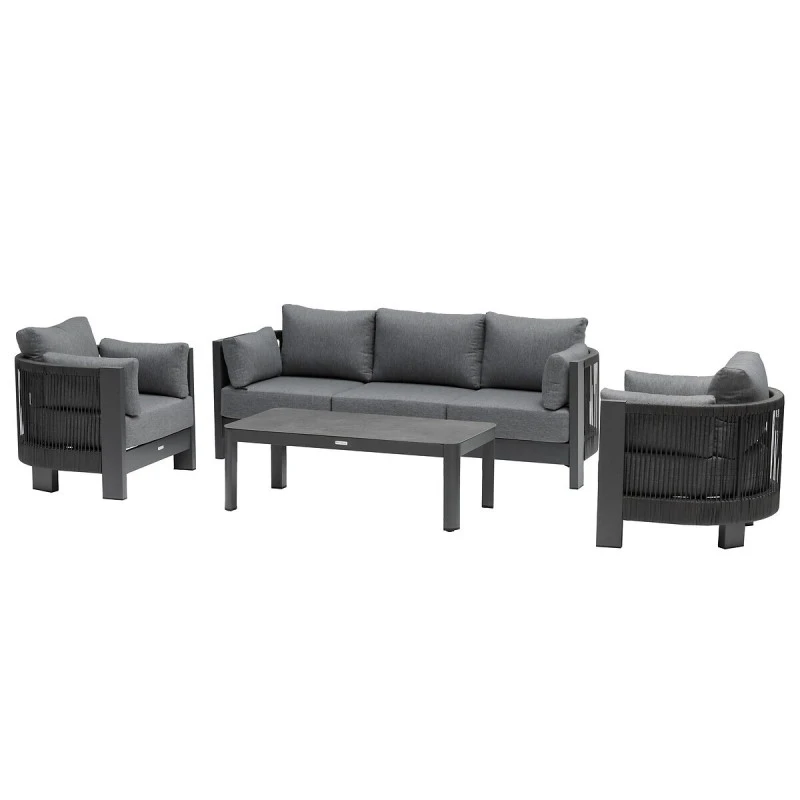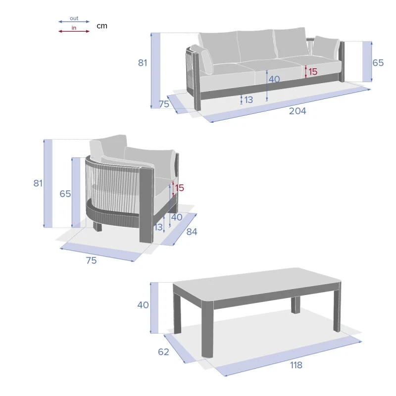 Très rĂ©sistant, ce salon dispose d’une structure en aluminium traitĂ© Ă©poxy antirouille. Les coussins d’assise en olĂ©fine (230 g/m²) sont conçus pour rĂ©sister Ă la dĂ©coloration et aux pluies fines. Ils sont dĂ©houssables pour un entretien facile. Enfin, les cordes sont en acrylique et le plateau en rĂ©sine plastique.