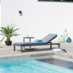Une crĂ©ation HespĂ©ride, le transat Evasion structure en aluminium graphite et coussin anthracite inclus.Â